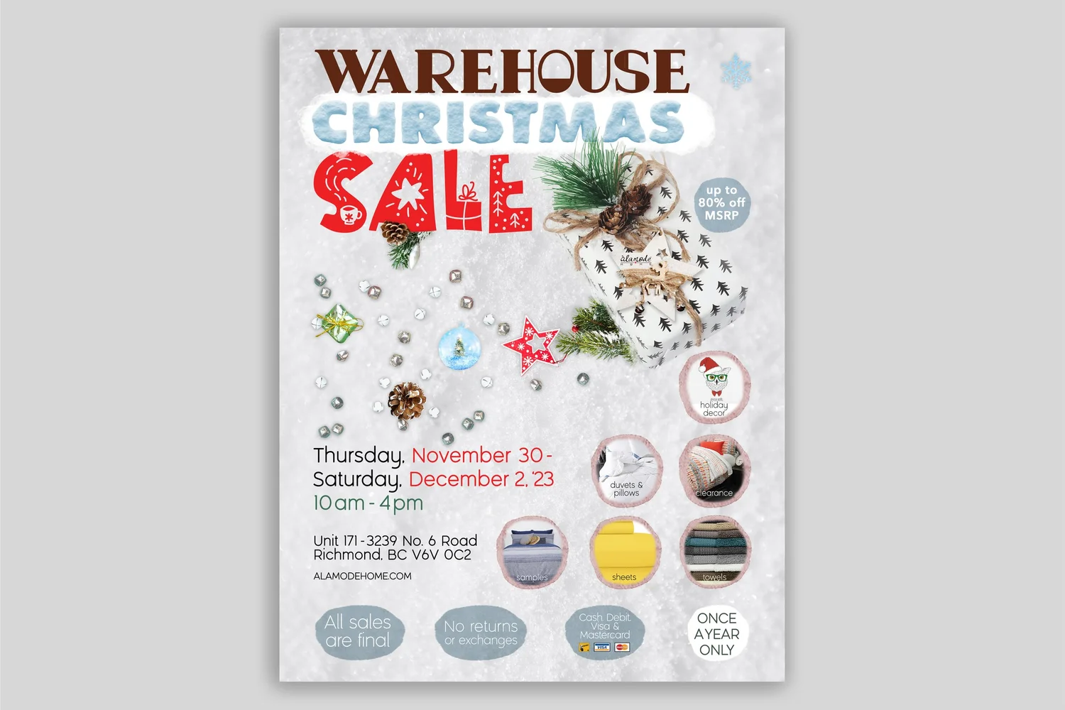Warehouse Christmas Sale  poster  made in Photoshop and Illustrator for   Àlamode Home   in November 2023